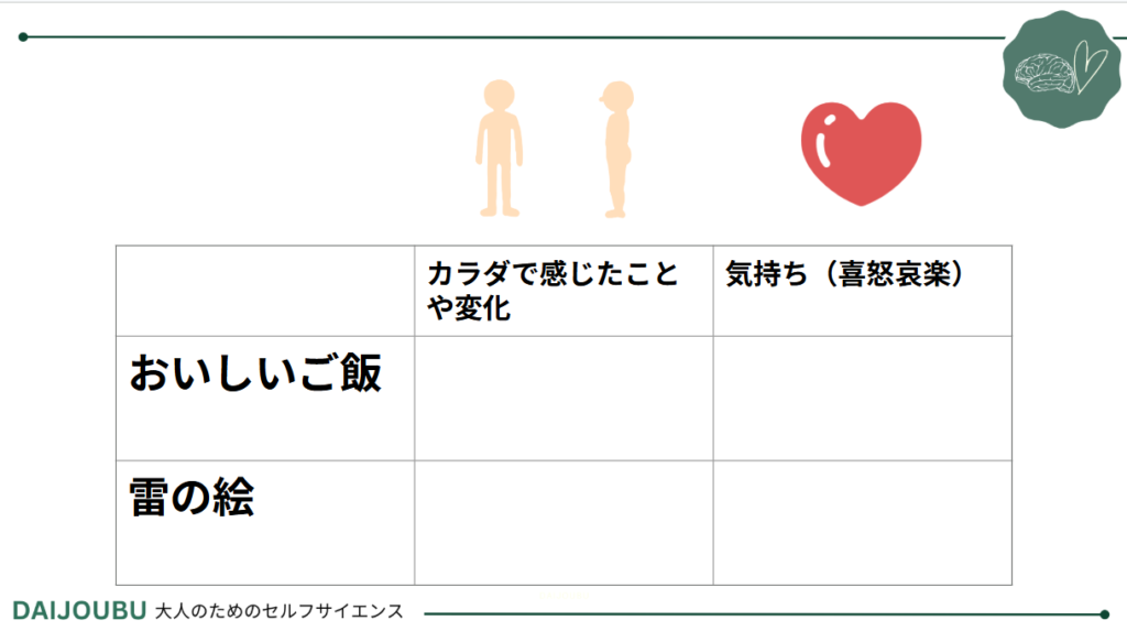 「どんな気持ちだろう」「どう考えているだろう」ではなく、まずは身体反応――つまりカラダで感じたことに目を向けました。自分の体でどんな反応が起きたのか、どの場所がどのような状態になったのかを書き出してみました。